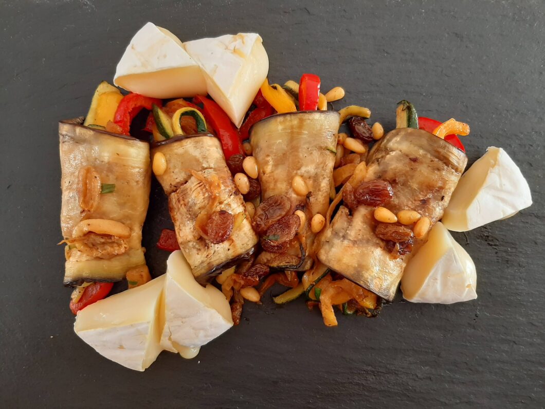- disponete le fette di melanzane su un tavolo da lavoro e farcitele con un cucchiaio di verdure spadellate. Avvolgete le fette a forma di involtini e adagiate nei piatti. Cospargete gli involtini con l’erba cipollina e servite. Io ho aggiunto dei triangolini di tomino per concludere il piatto.