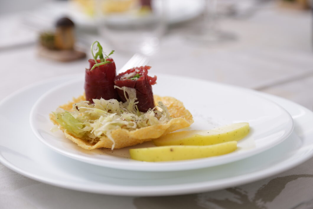 prendere la carne salada. Se le vostre fettine sono particolarmente fine userete due fettine per creare un cilindro. Riponete due fettine una sopra l’altra, appoggiate sopra un po’ di rucola, 3-4 pinoli, delle scaglie di grana e richiudete la carne creando un involtino. Questo a sua volta verrà tagliato a metà (in questo modo con due fette create un involtino, che tagliato formerà due bocconi; - passiamo a comporre il piatto. Prendiamo la nostra cialda che riempiremo con il capusso. Riponiamo i nostri due bocconi di carne salata nel piatto, tagliamo delle fette sottili di mela che useremo per fare freschezza al piatto. Un filo di olio e pepe e il piatto è pronto.