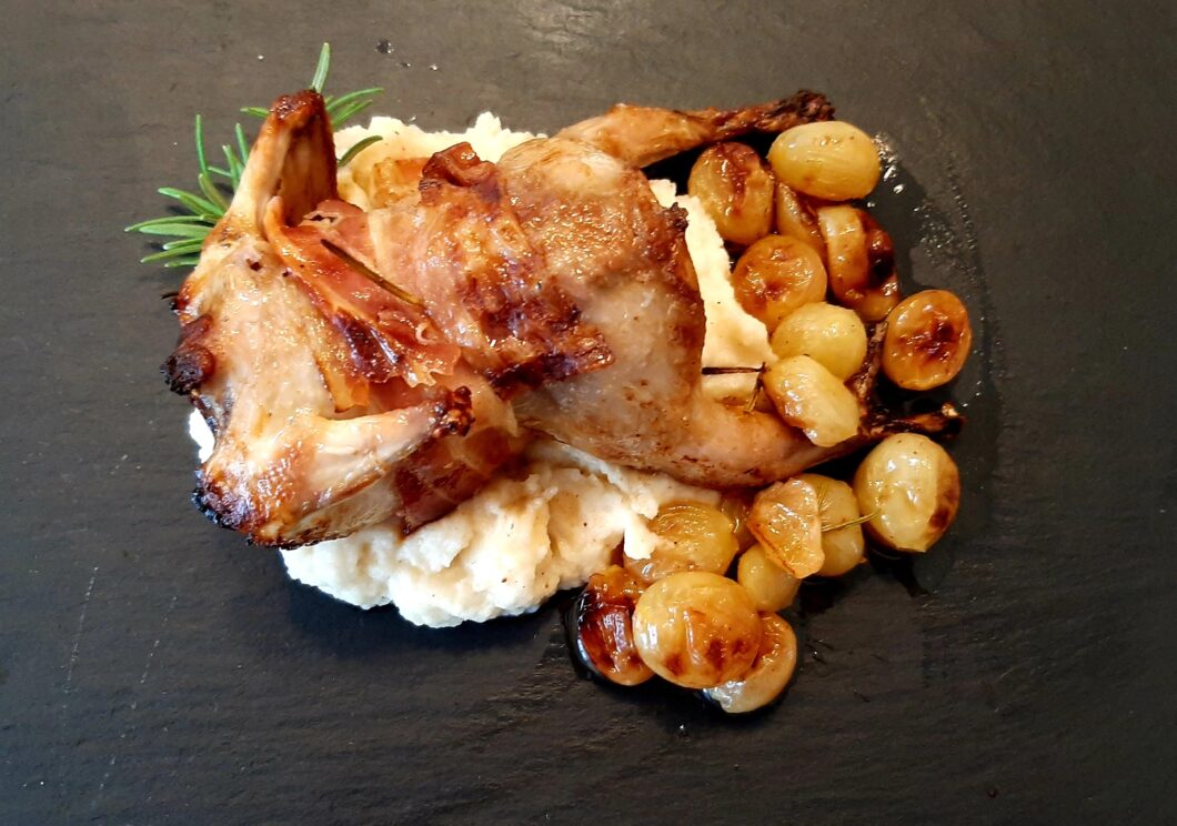 - farcite le quaglie con l’uva avvolta nelle fette di pancetta (daranno molto gusto in fase di cottura);