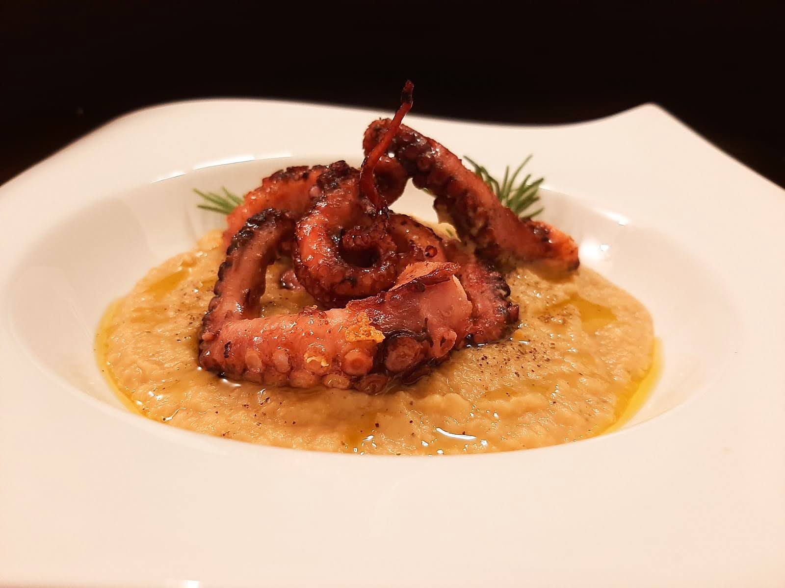 - componete il piatto mettendo alla base la crema, posate sopra il vostro polpo, un rametto di rosmarino, un filo di olio, un po’ di pepe e….buon appetito.