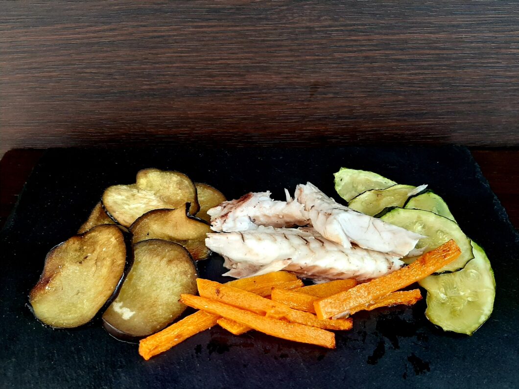 impiattate. Prendere il vostro branzino. Apritelo in modo da ricavare 4 filetti. Assicuratevi di togliere tutte le lische. Adagiate sul piatto contornando il pesce con le vostre verdure.