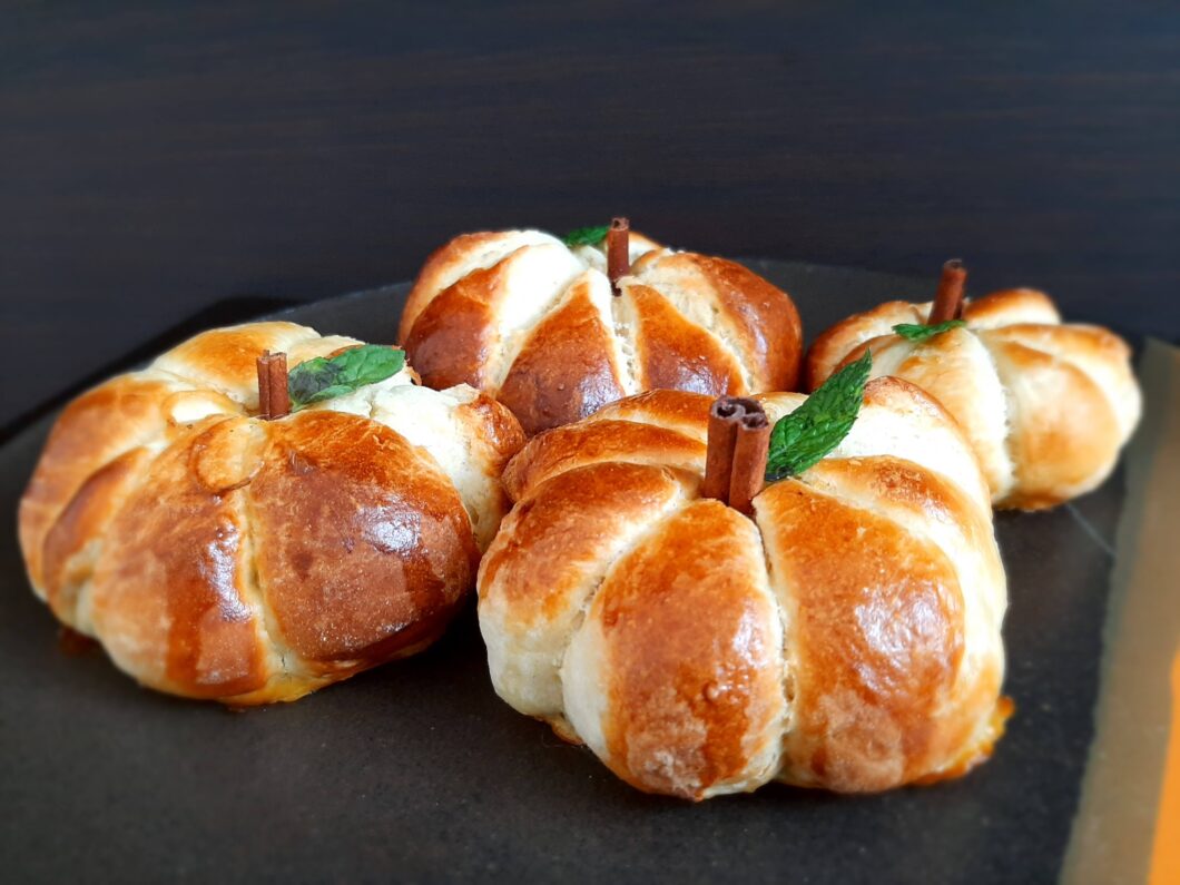 • una volta cotti e belli dorati, fateli intiepidire un po’ e togliete lo spago. Per farli somigliare ancora di più a una zucca, mettete sopra al centro un pezzetto di stecco di cannella.
