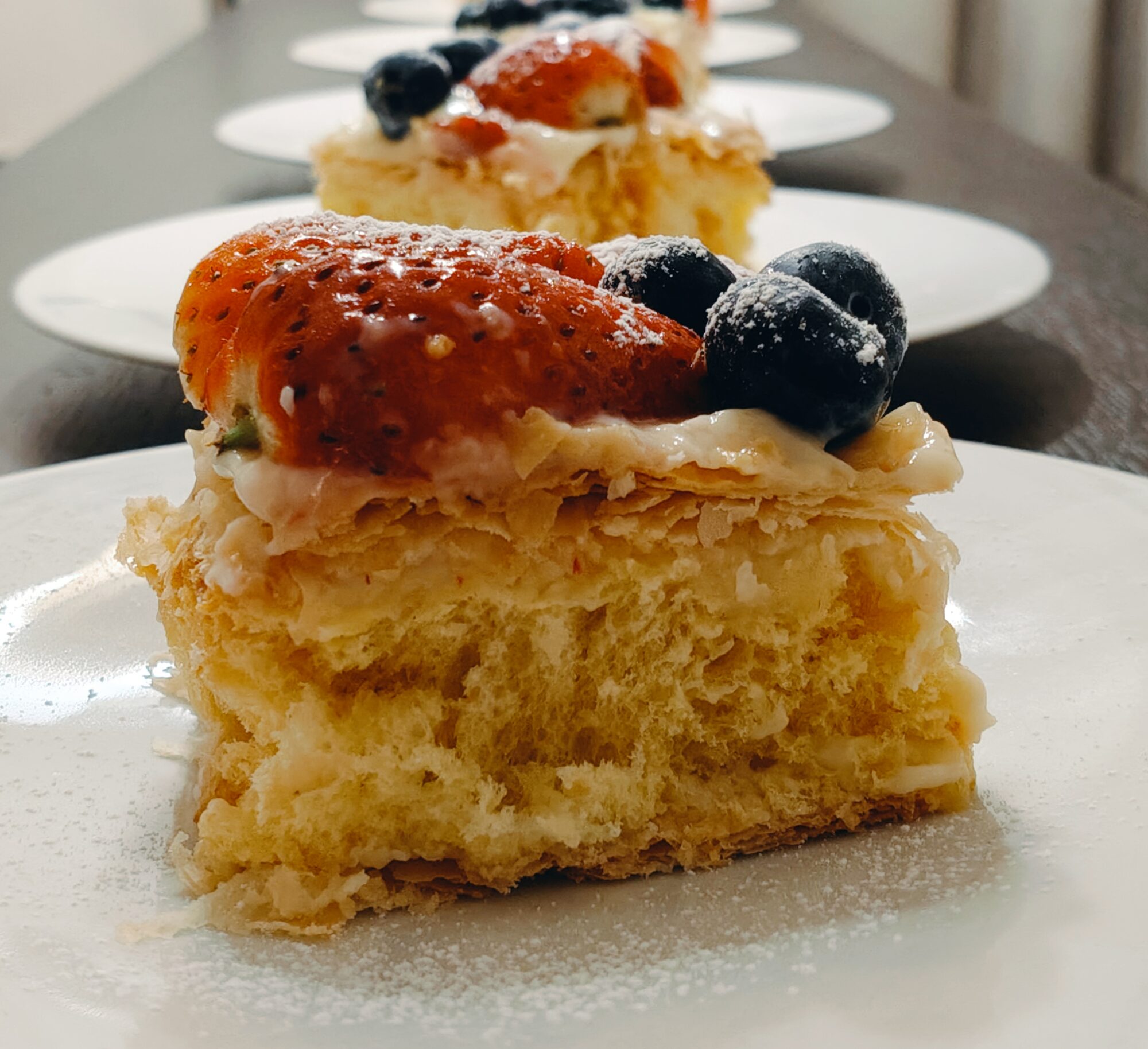 - se volete arricchire il dolce con dei frutti di bosco vi consiglio mettere un velo di crema anche sopra l’ultimo strato di sfoglia, questa farà sì che la vostra frutta non “scappi”, oppure potete mettere della panna fresca montata (farà lo stesso effetto di “collante”). Posizionate a piacere la vostra frutta;