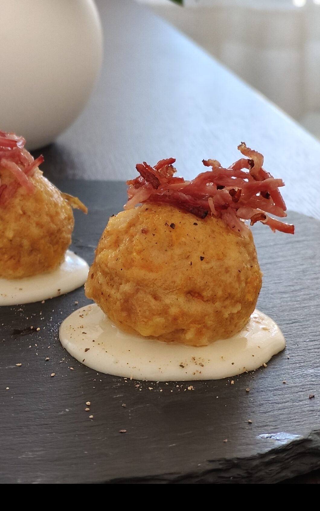 • per fare la vostra crema di parmigiano vi basterà mettere in un pentolino il formaggio grattugiato, un po’ di panna fresca e mescolare bene per non fare grumi (aggiustate di sale). Potete aiutarvi con un po’ di besciamella o di ricotta o di latte per rendere il tutto più cremoso. Infine io ho voluto terminare il piatto con degli straccetti di speck che ho fatto rosolare in padella.