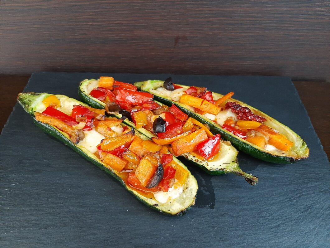 - estraete la placca da forno e guarnite le barchette di zucchine ormai dorate con i peperoni, le striscioline di mozzarella e qualche oliva. Infornate altri 5 minuti per sciogliere leggermente la mozzarella;