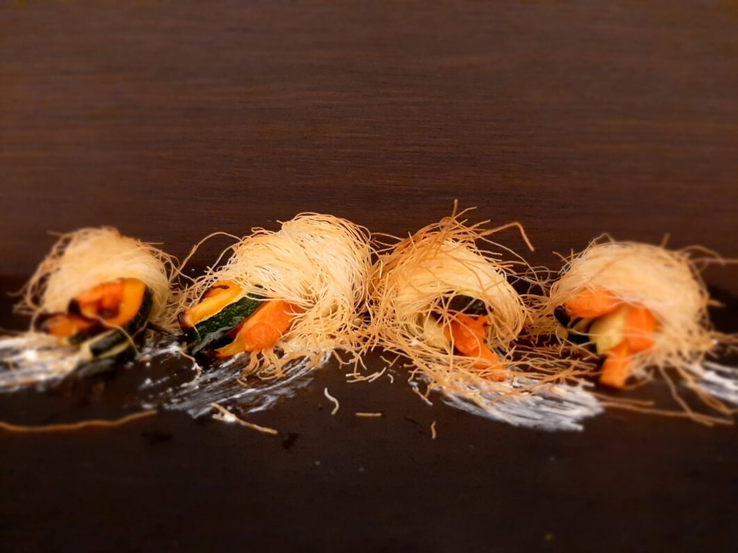 - una volta pronte le vostre verdure avvolgetele nella pasta kataifi, come fosse un gomitolo;