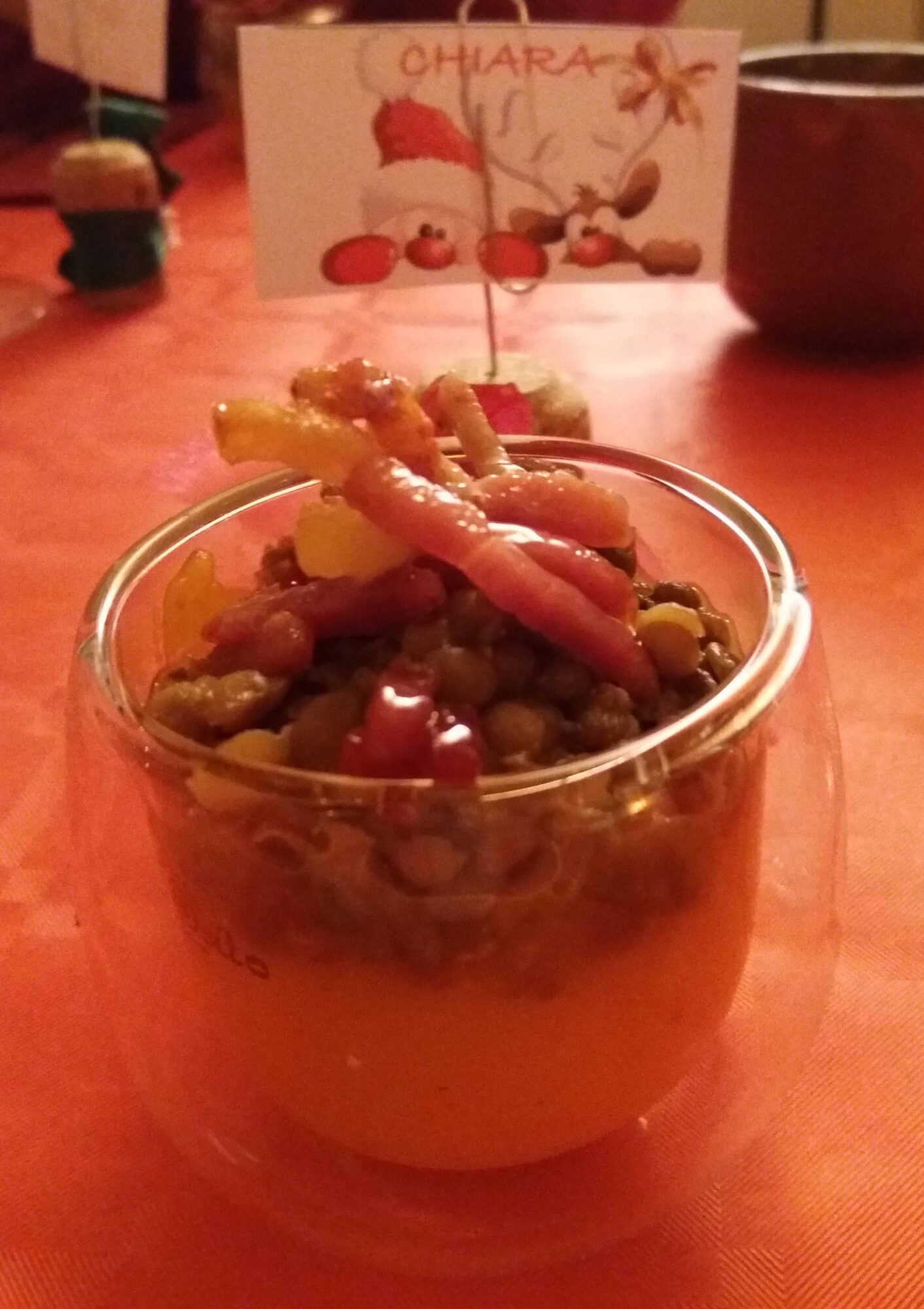 - componete il vostro bicchierino mettendo la crema alla base del vostro bicchierino, sopra le lenticchie ed infine lo speck.