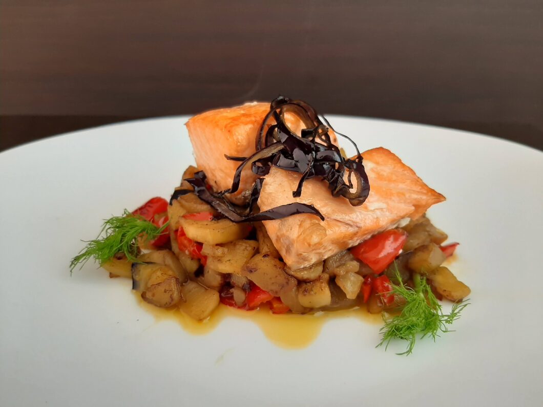 - quanto verdure e salmone sono pronti componete il vostro piatto.