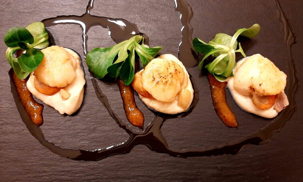 - completate il piatto distribuendo 3 ciuffi di purè di castagne, accomodate su ognuno una capasanta, condite con un filo di olio. Completate con la salsa di cachi. Pare un tocco di verde usate dello spinacino, della valeriana o del soncino.