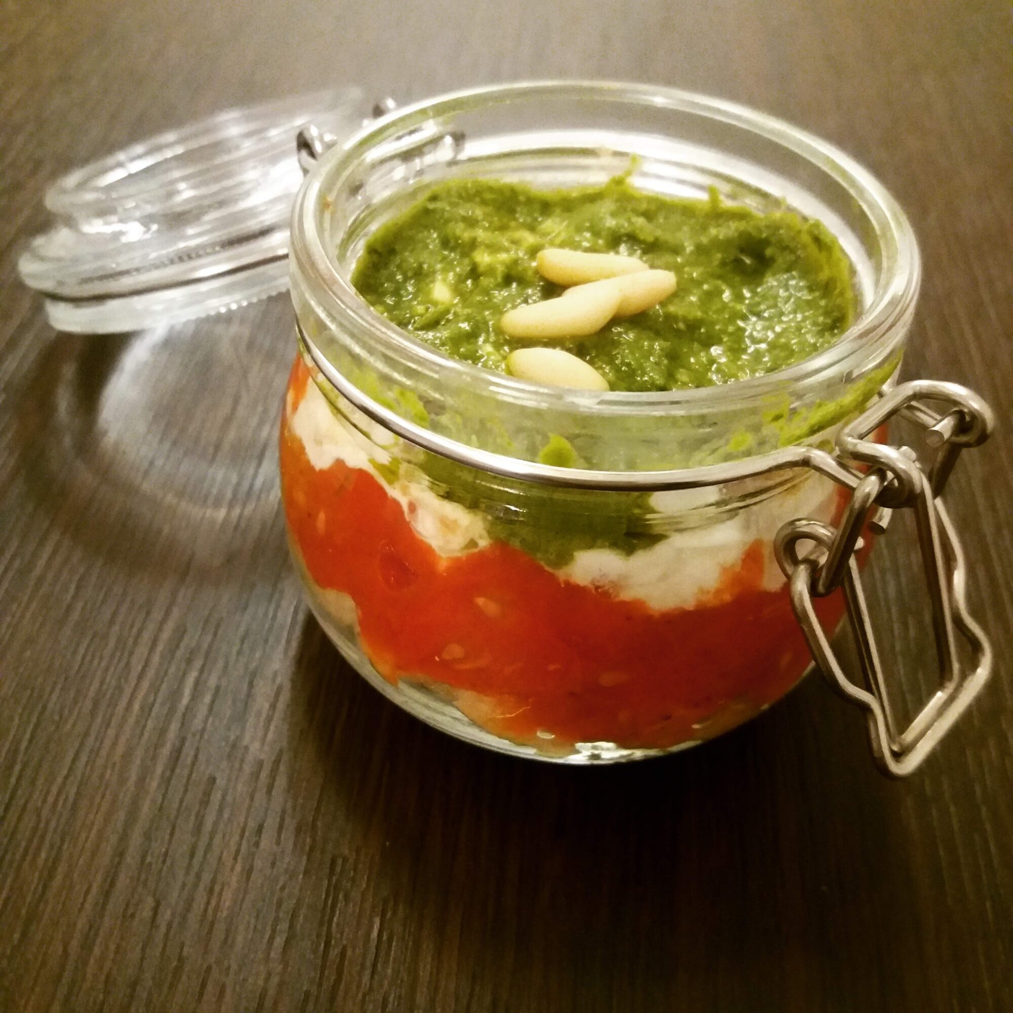 - iniziate a comporre la caprese partendo dai pomodorini che comporranno la vostra base; il secondo strato è composto dalla mozzarella ed infino il pesto;