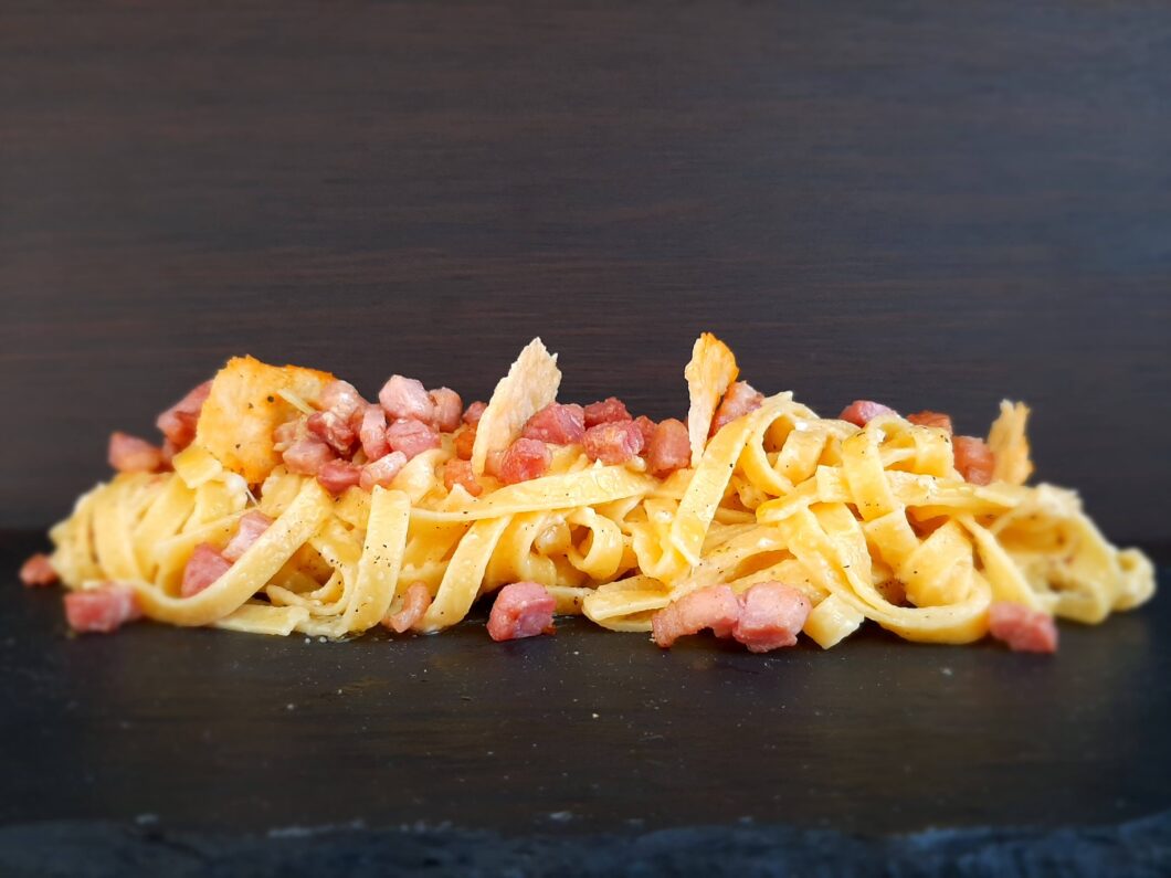 - nel frattempo l’acqua è arrivata a temperatura, salate, cuocete gli spaghetti (ci metteranno pochi minuti essendo la pasta fresca) e scolateli in padella dove verserete direttamente la vostra crema fatta con le uova, formaggio e pepe. Aggiungete la pancetta e mantecate velocemente la pasta;