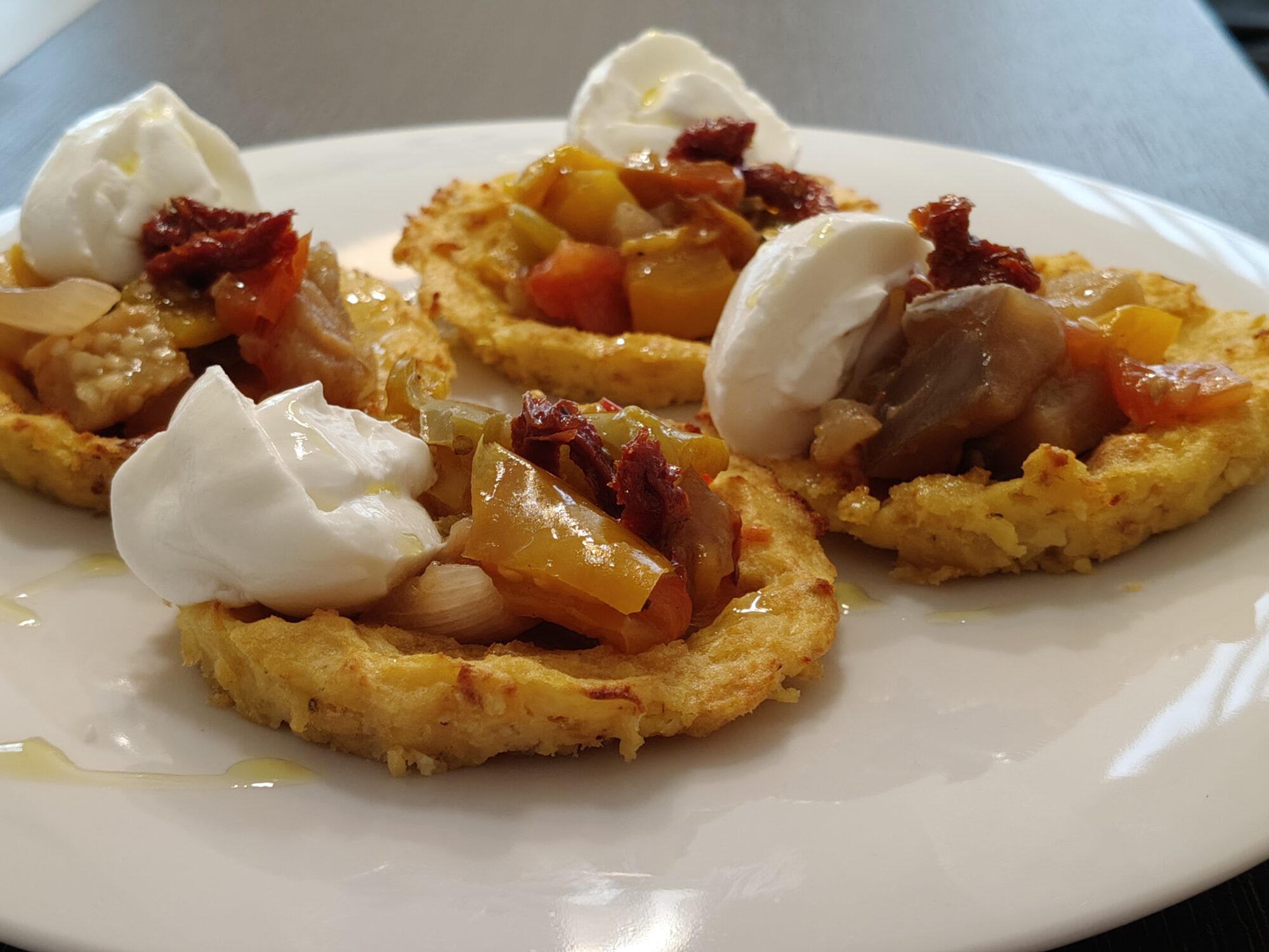 - Farcite i cestini di patate con quello che più vi piace (io ho usato della peperonata e delle mozzarelline).