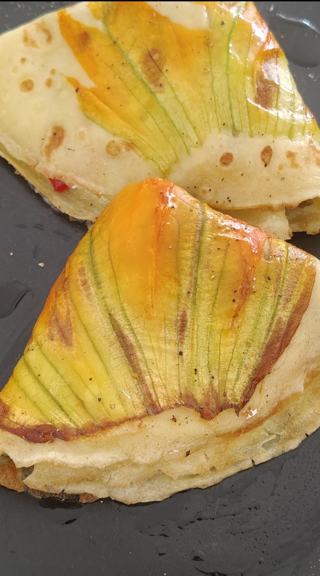 - lasciate cuocere la pastella (qualche minuto, anche meno se la padella e bella calda) e poi girate la crêpe per far sì che anche il lato con il fiore di zucca sia cuocia;