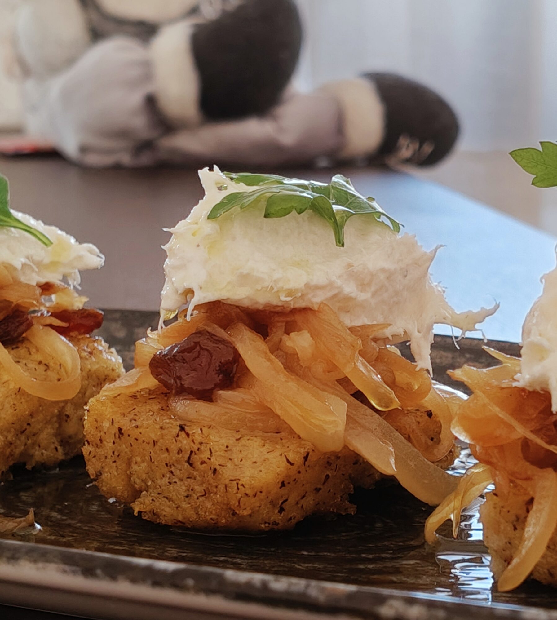 - ora avete tutti gli elementi per procedere con l’impiattamento. Mettete sopra il vostro crostino le cipolle con l’uvetta e i pinoli e terminato con un cuchiaio di baccalà. Io ho terminato con una fogliolina di prezzemolo.