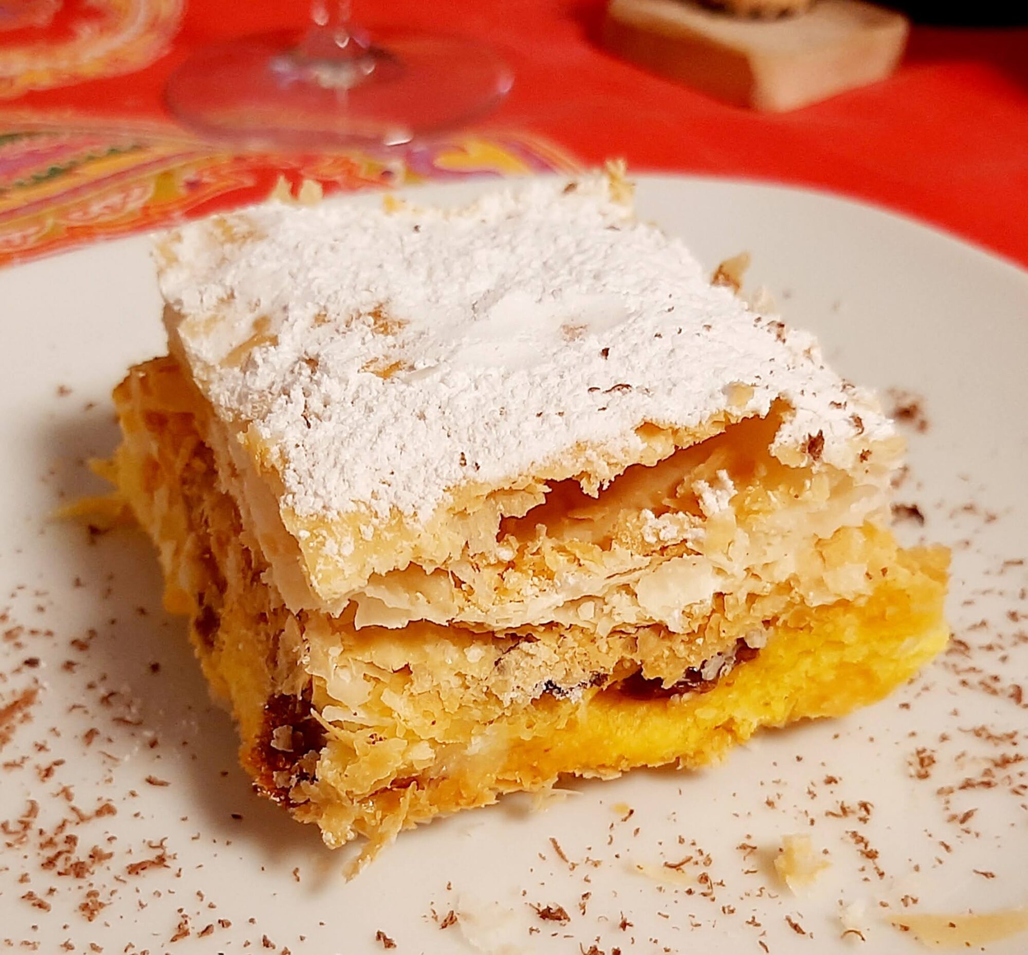 - passate alla composizione del dolce. Partite dalla base con la sfoglia, proseguite con un bello strato di crema pasticcera, le fette di panettone (che metterete una a fianco all’altra), nuovamente la crema pasticcera e concludete con la sfoglia. Date il tocco finale con una bella spolverata di zucchero a velo;