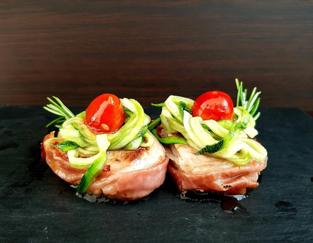 - iniziate la preparazione di questo piatto dalla carne, ricavando i medaglioni dai vostri filetti di maiale, salate pepate. Mettete il burro e un filo d’olio in una padella. Avvolgete i vostri medaglioni con due fette di prosciutto, adagiateli nella padella e fateli rosolare per 8-10 minuti (girandoli su se stessi al fine di ottenere una cottura omogenea);