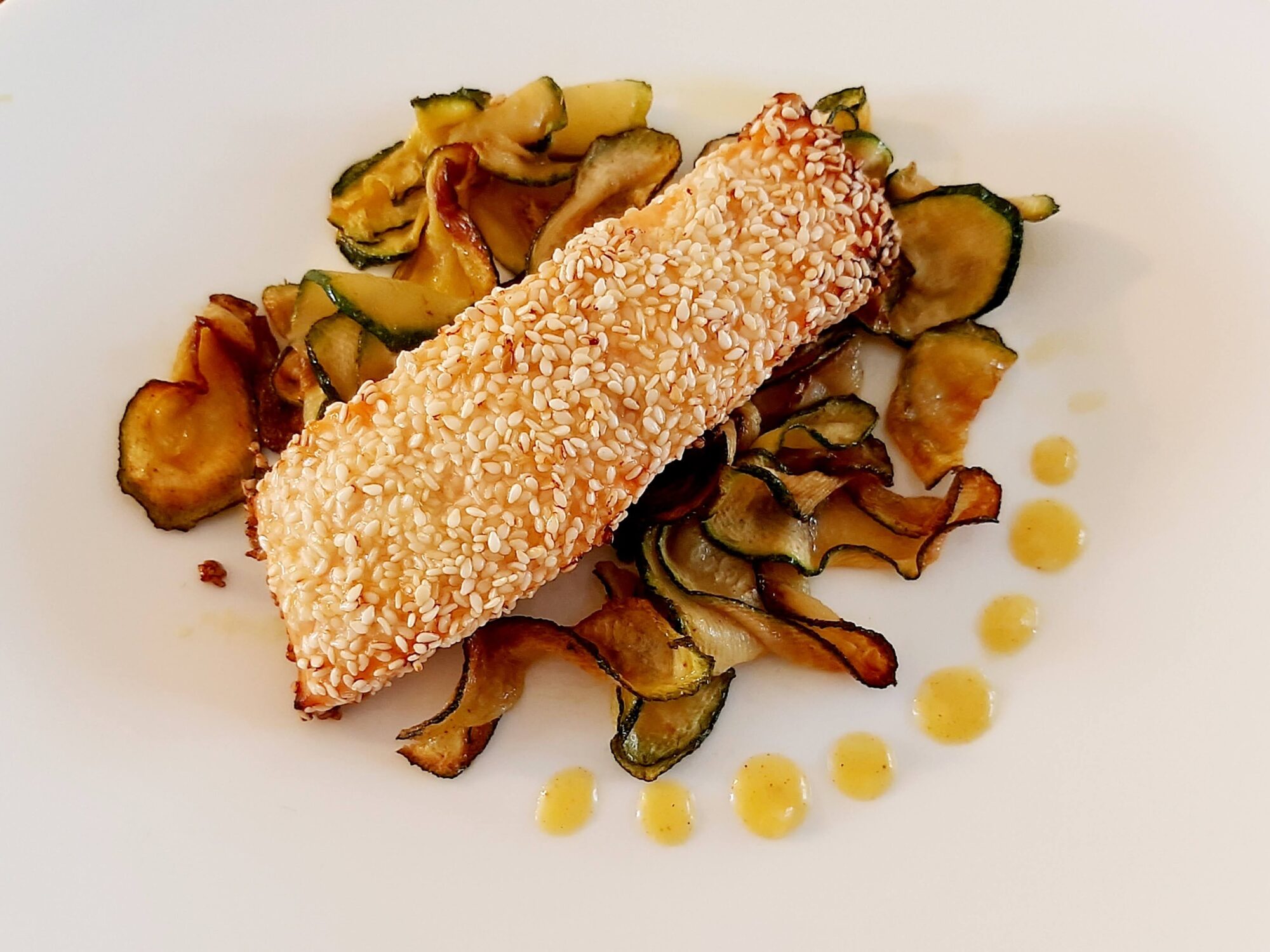 • lasciate marinare il salmone in un succo di arancia per circa un’ora, dopo di che passate il filetto nel sesamo, in modo da creare una bella impanatura;