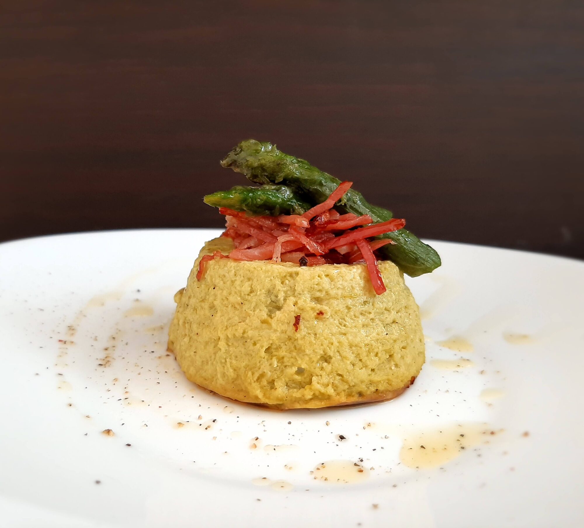 - terminate il vostro piatto prendendo gli asparagi che avete tenuto da parte; fate appassire lo speck in una padella fino a quando non sarà bello croccante. Posizionatelo sopra il vostro flan e servite in tavola.