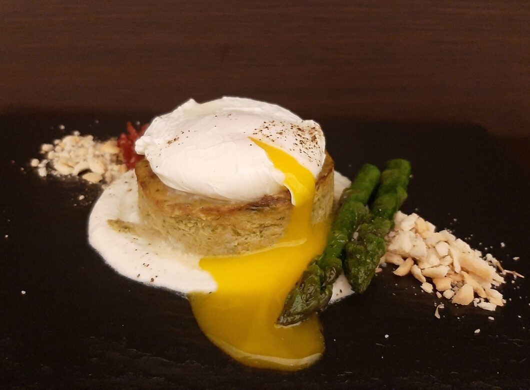 Quando l’acqua avrà raggiunto il bollore, con l’aiuto di un cucchiaio creare un vortice e fate scivolare al centro dello stesso l’uovo. Abbassate di colpo la fiamma e cuocere per circa 3/4 minuti. - quando tutto sarà pronto, non vi resterà che impiattare, versando al centro del piatto la fonduta di parmigiano, adagiate sopra con delicatezza il flan di asparagi, appoggiate sopra il nostro ovetto in camicia e spolverizzate il piatto con il crumble di taralli.