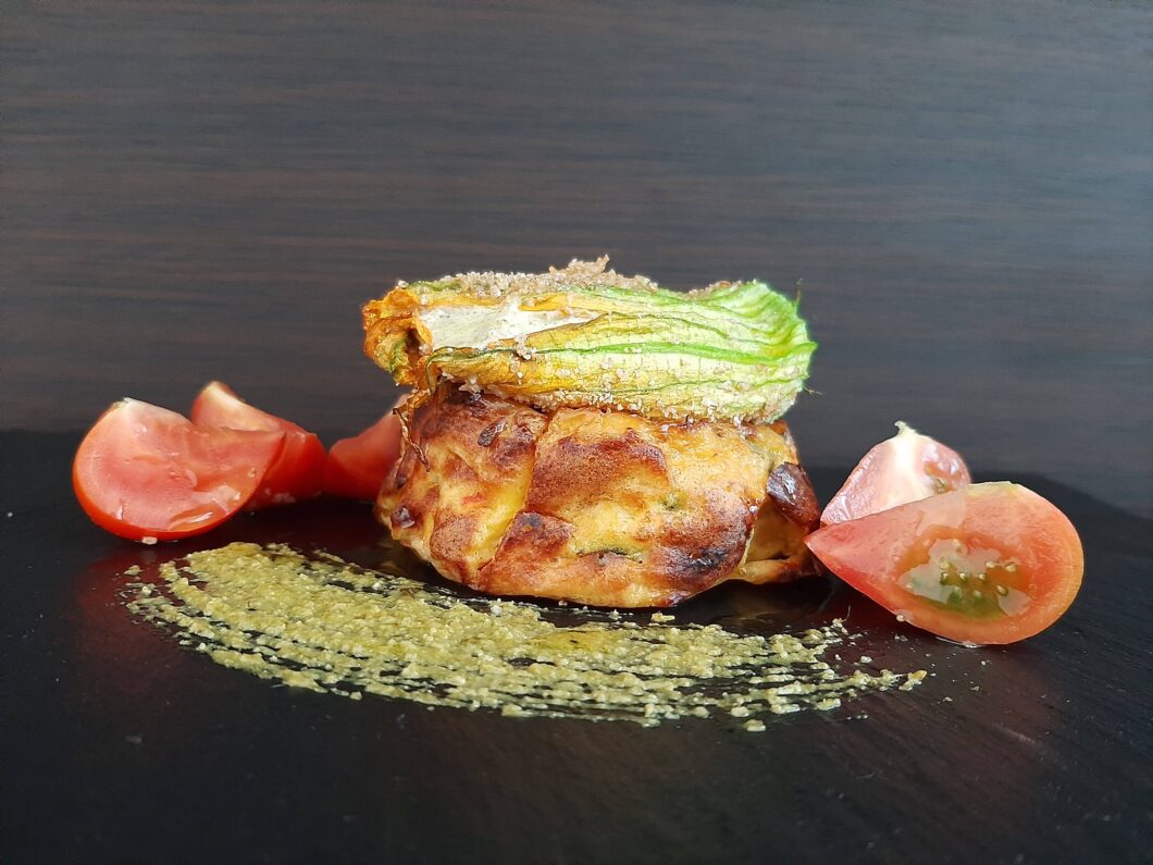 Frittata di zucchine con fiori di zucca e pomodorini