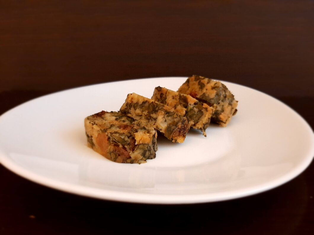 Il procedimento è lo stesso ma, invece di fare singoli fagottini ho riposto le foglie di vite una a fianco all’altra, ho messo al centro l’impasto, ho chiuso le foglie, avvolte prima in carta stagnola e infine in uno straccio. Ho cotto così il mio “salame” , sempre per un’ora. Questo mi ha permesso di presentare le fettine come fosse un salame.