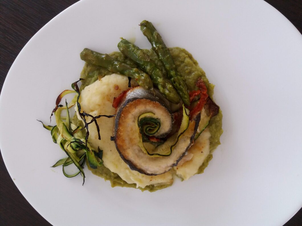 Involtino di branzino con asparagi e purè
