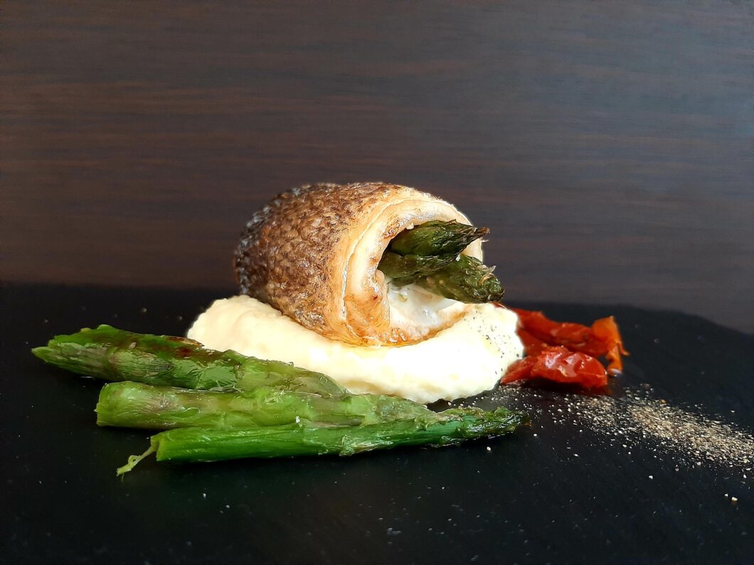 - avete tutti gli ingredienti per comporre il vostro piatto. Mettete alla base il purè, posizionate sopra il vostro involtino, a fianco gli asparagi croccanti.