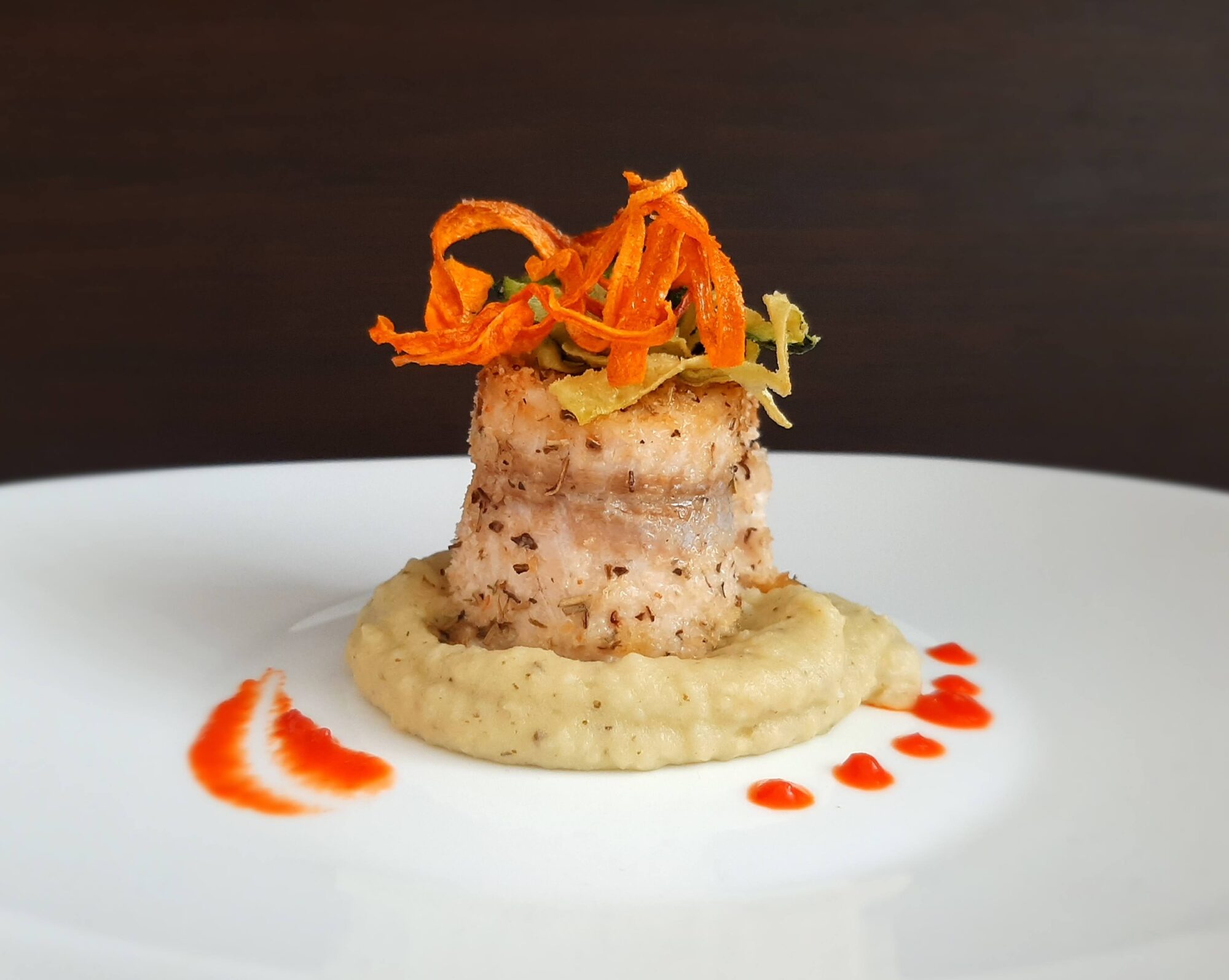 - avete tutti gli ingredienti per comporre il vostro piatto. Mettete alla base il purè, posizionate sopra il vostro involtino, terminate con le verdure croccanti.