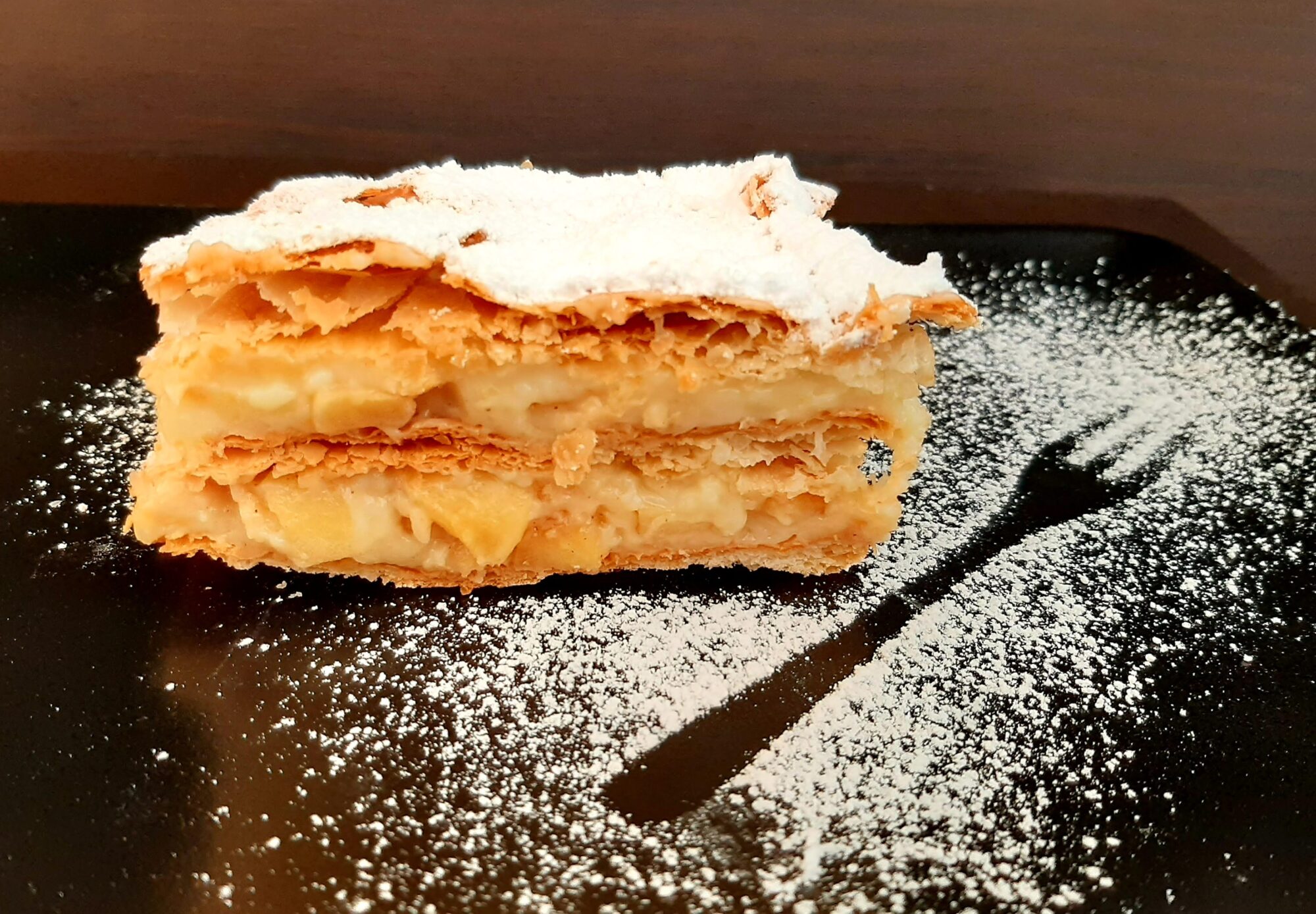 - passate alla preparazione del dolce. Partite dalla base con la sfoglia, proseguite con un bello strato di crema pasticcera con le mele, un secondo foglio di sfoglia, nuovamente crema e mele, infine un ultimo foglio di sfolia. Date il tocco finale con una bella spolverata di zucchero a velo;