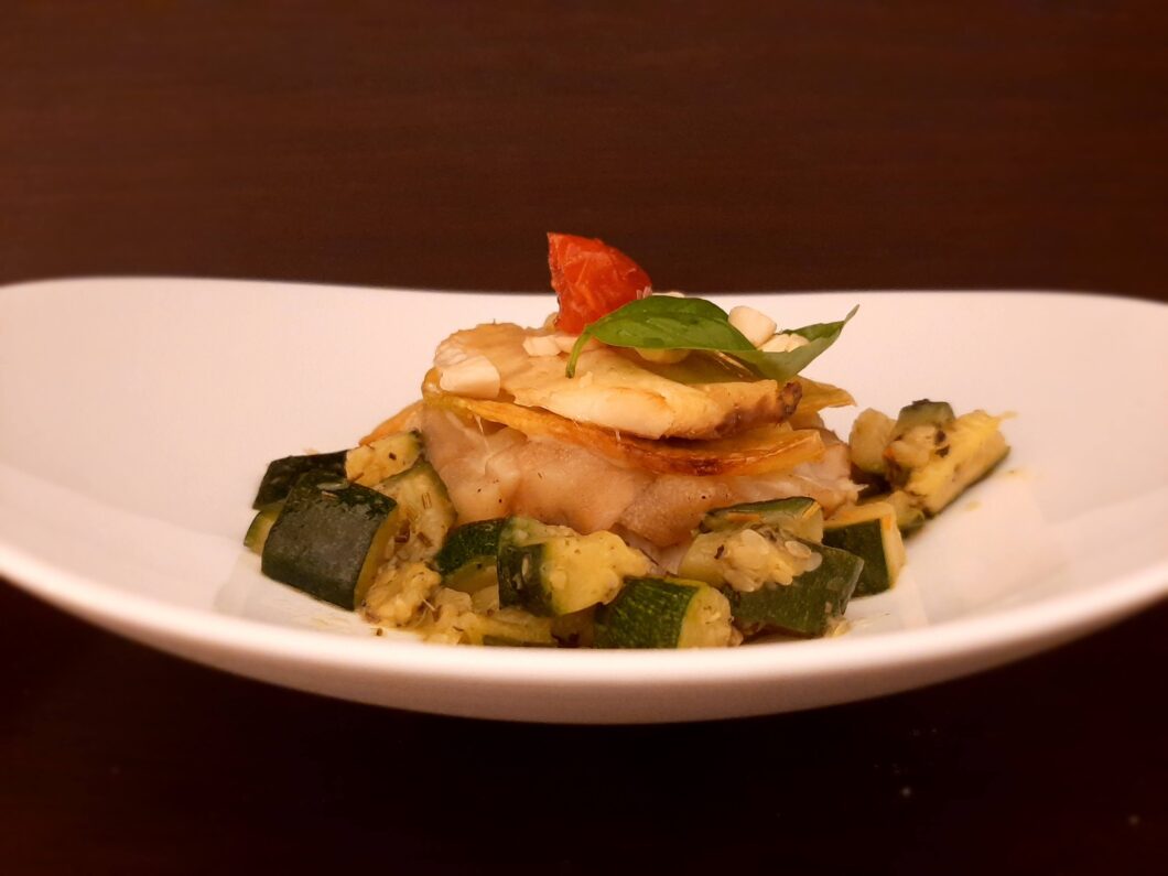 - completiamo il piatto con una dadolata di zucchine che avremmo precedentemente preparato. Lavate e tagliate le zucchine a dadini. Mettetele in una padella con un filo di olio e fate cuocere per circa 15-20 minuti. Aggiustate di sale e pepe e, se lo avete, anche un cucchiaio di pesto che renderà la vostra dadolata cremosa.
