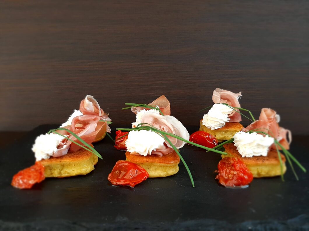 - decorate con mezza fetta di prosciutto crudo, con delle foglioline di erba cipollina e pomodorini secchi.