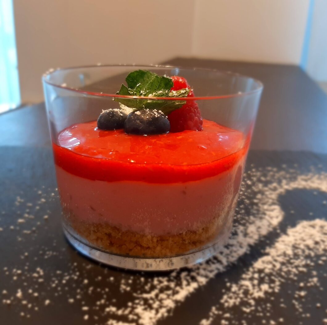 - prima di servire terminate versando la crema di lamponi che avete tenuto da parte (quella senza mascarpone) creando così l’ultimo strato;