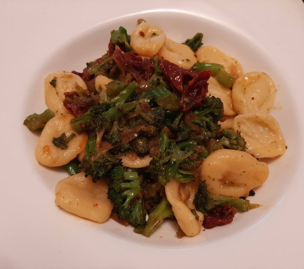 - in una padella preparare un soffritto con un filo d’olio, unire i broccoli lessati. Lasciare cuocere a fiamma bassa con il coperchio in modo da permettere alle cimette di insaporirsi e ammorbidirsi ulteriormente. Eventualmente aggiungere mezzo mestolo d’acqua di cottura dei broccoli;