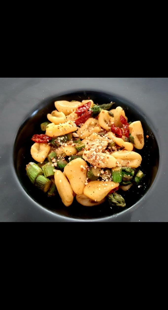 Orecchiette con asparagi, pomodori secchi e nocciole