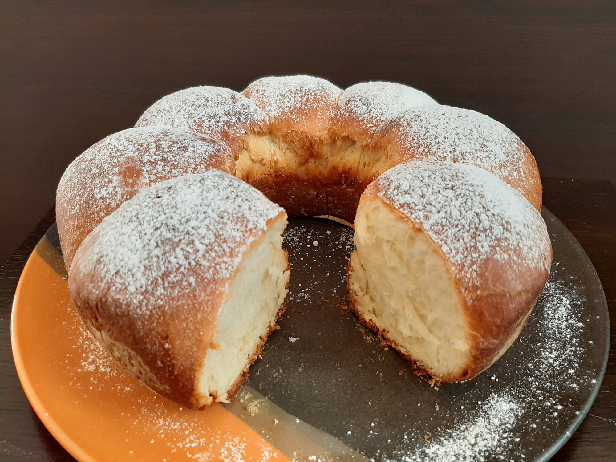 • il pan brioche allo yogurt è bello dorato in superficie, una volta sfornato spennellate con un po’ d’acqua e spolverizzate di zucchero a velo.