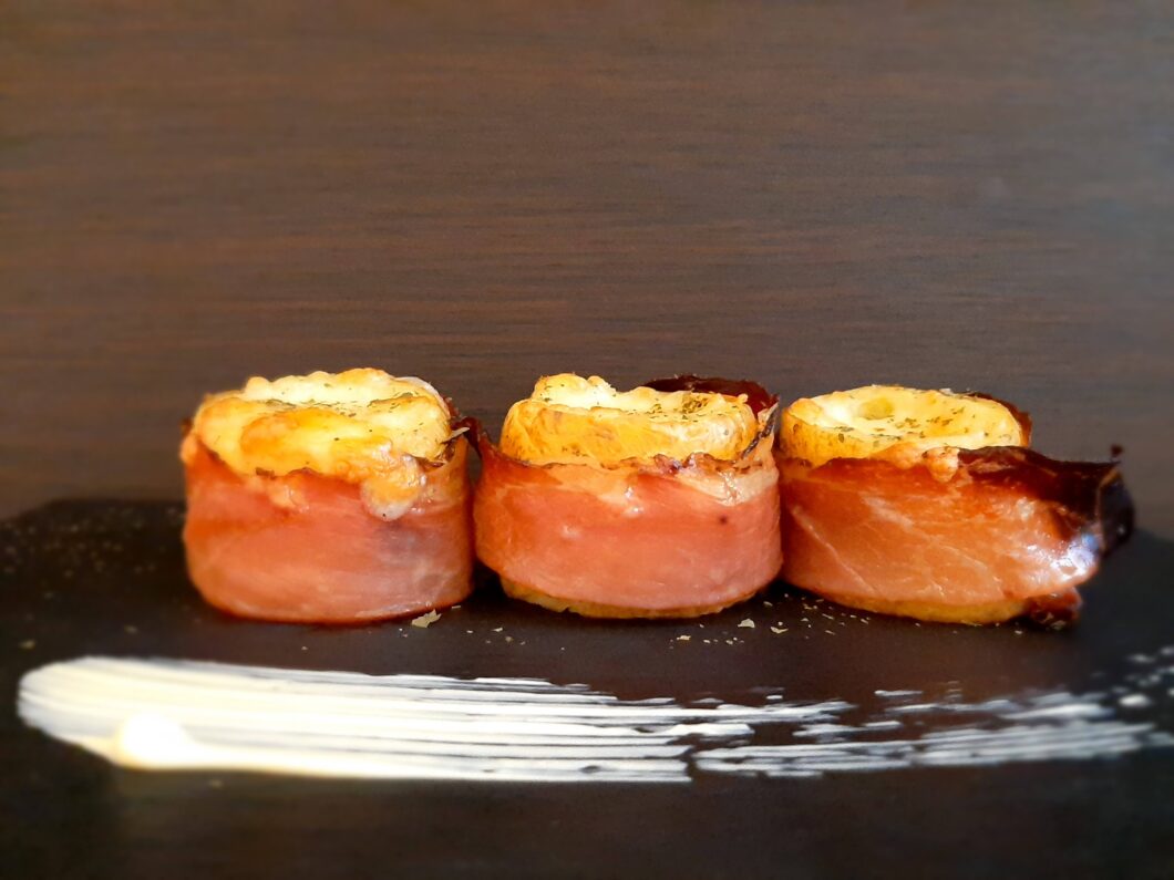 - avvolgete ogni patata con due fette di speck;