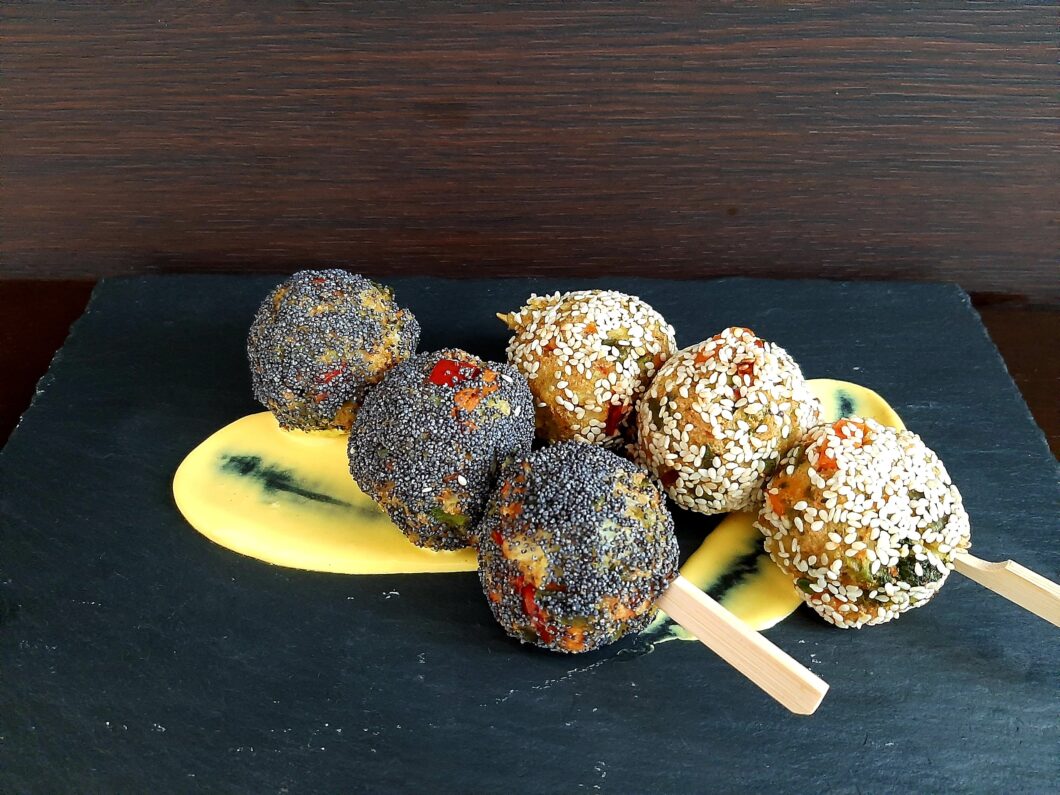 - formate con il composto delle polpette grandi all'incirca come una noce (io per comodità utilizzo lo strumento che si usa per fare le palline di gelato). Invece di passarle nel uovo e pane gratuggiato io le ho semplicemente passate nei semi di sesamo e in quelli di papavero;