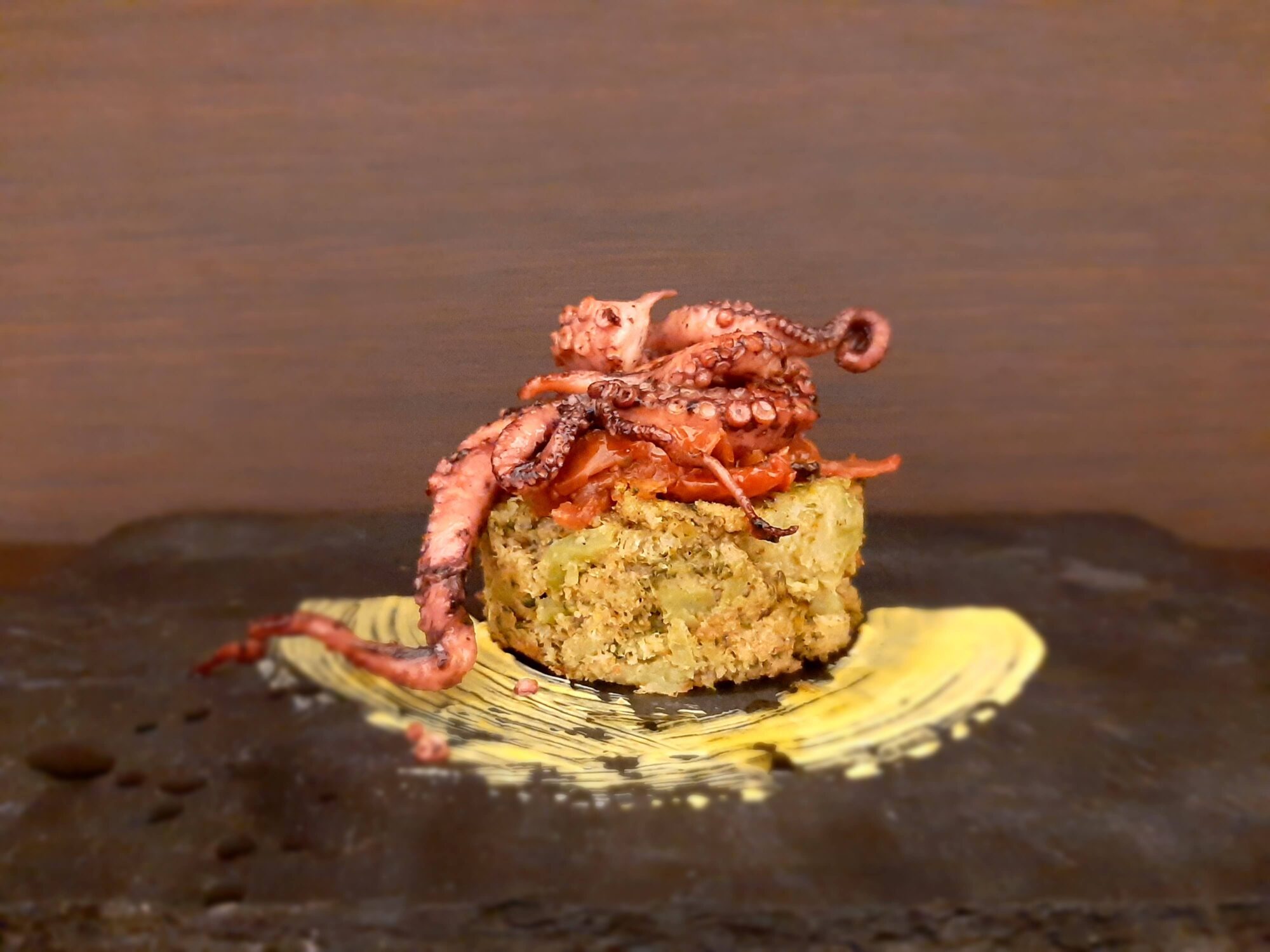 - una volta cotto toglietelo dal forno, adagiatelo su un piatto e mettete sopra il vostro polpo grigliato. Terminate con dei pomodorini secchi.