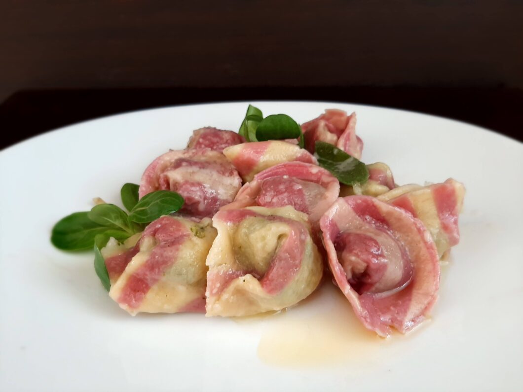 - per la pasta colorata: versate su una spianatoia i restanti 100 g di farina, fate la fontana e nel centro aggiungete l’estratto di barbabietola (in alternativa un uovo e della polvere rossa che da colore) iniziare ad amalgamare con una forchetta e poi impastare a mano fino a quando l’impasto risulta essere elastico. Fare riposare l’impasto per 30 minuti coperto con un canovaccio (a temperatura ambiente);