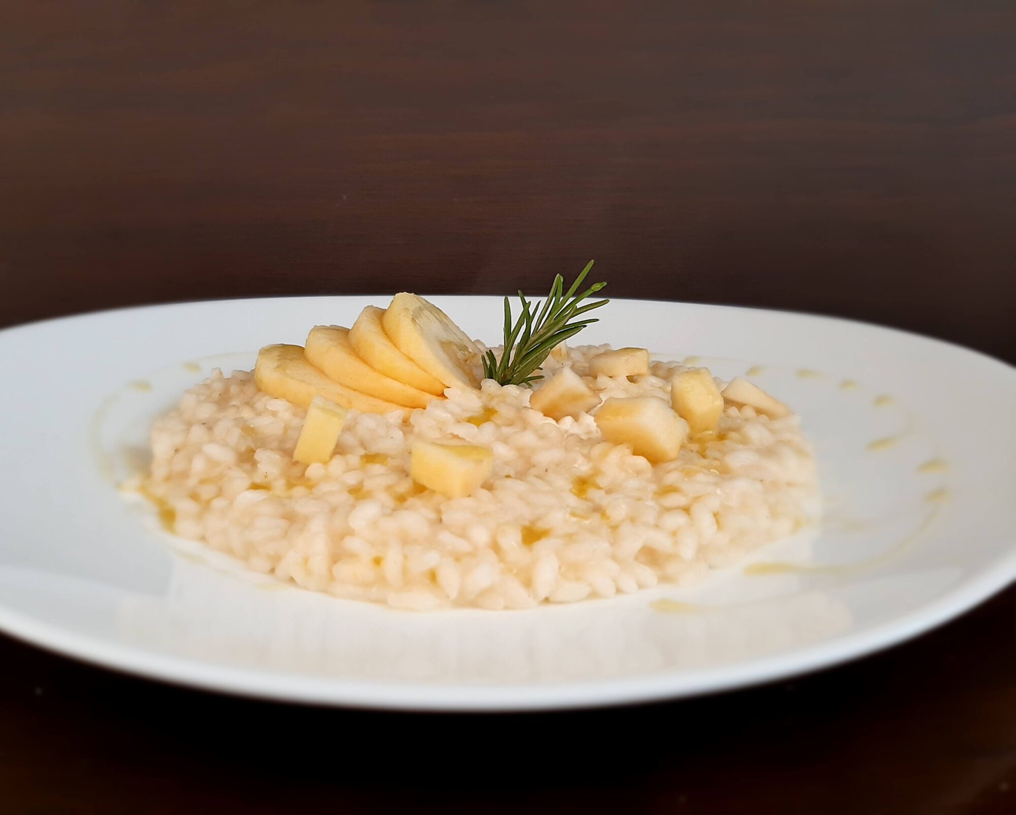- aggiungete alla cipolla il riso e fate tostare per 3 minuti. Aggiungete le mele, sfumate con vino bianco secco;