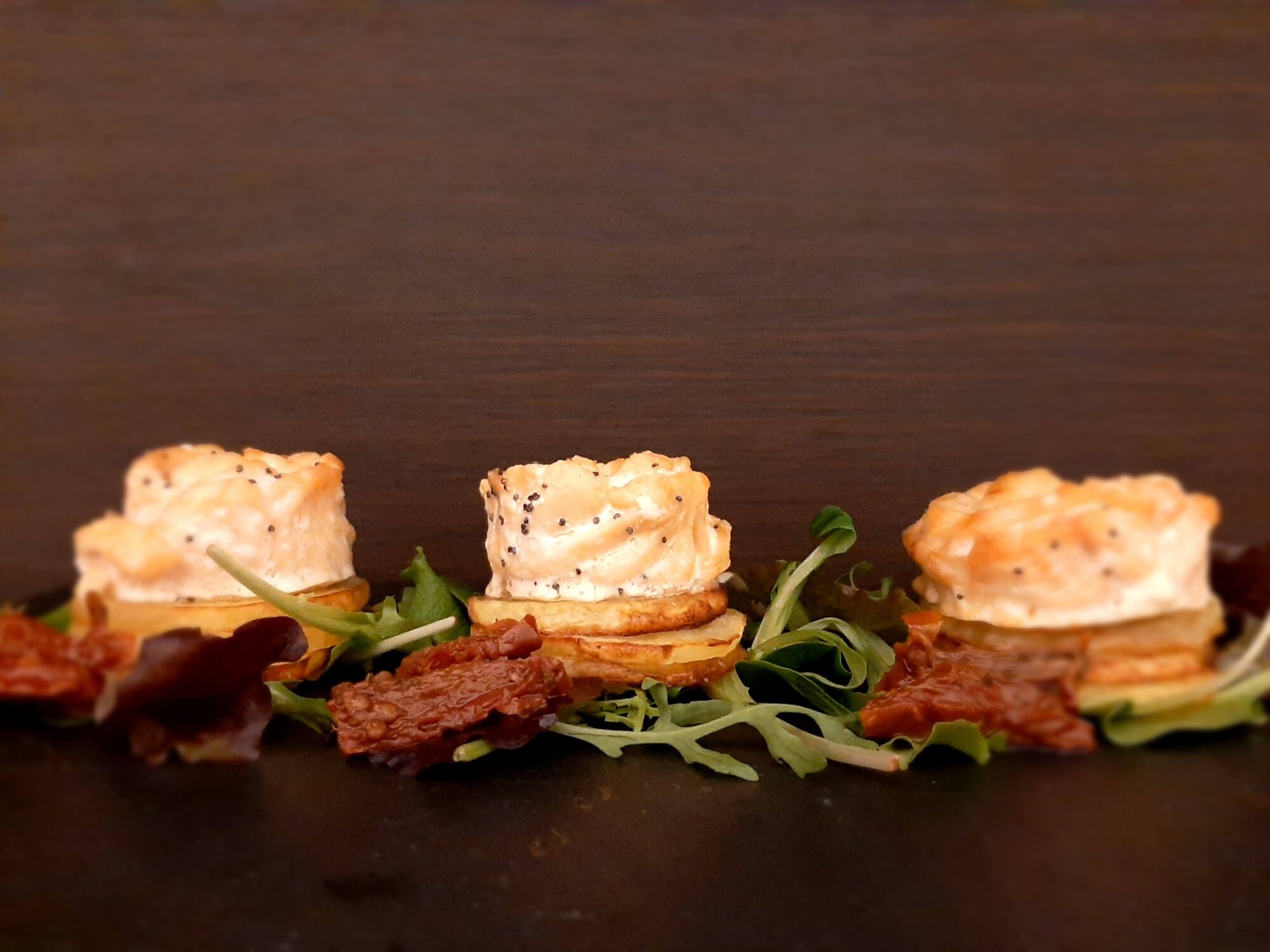 servite le vostre rose su un letto di rucola, appoggiandole sopra le patate al forno e guarnite con pomodorini secchi.