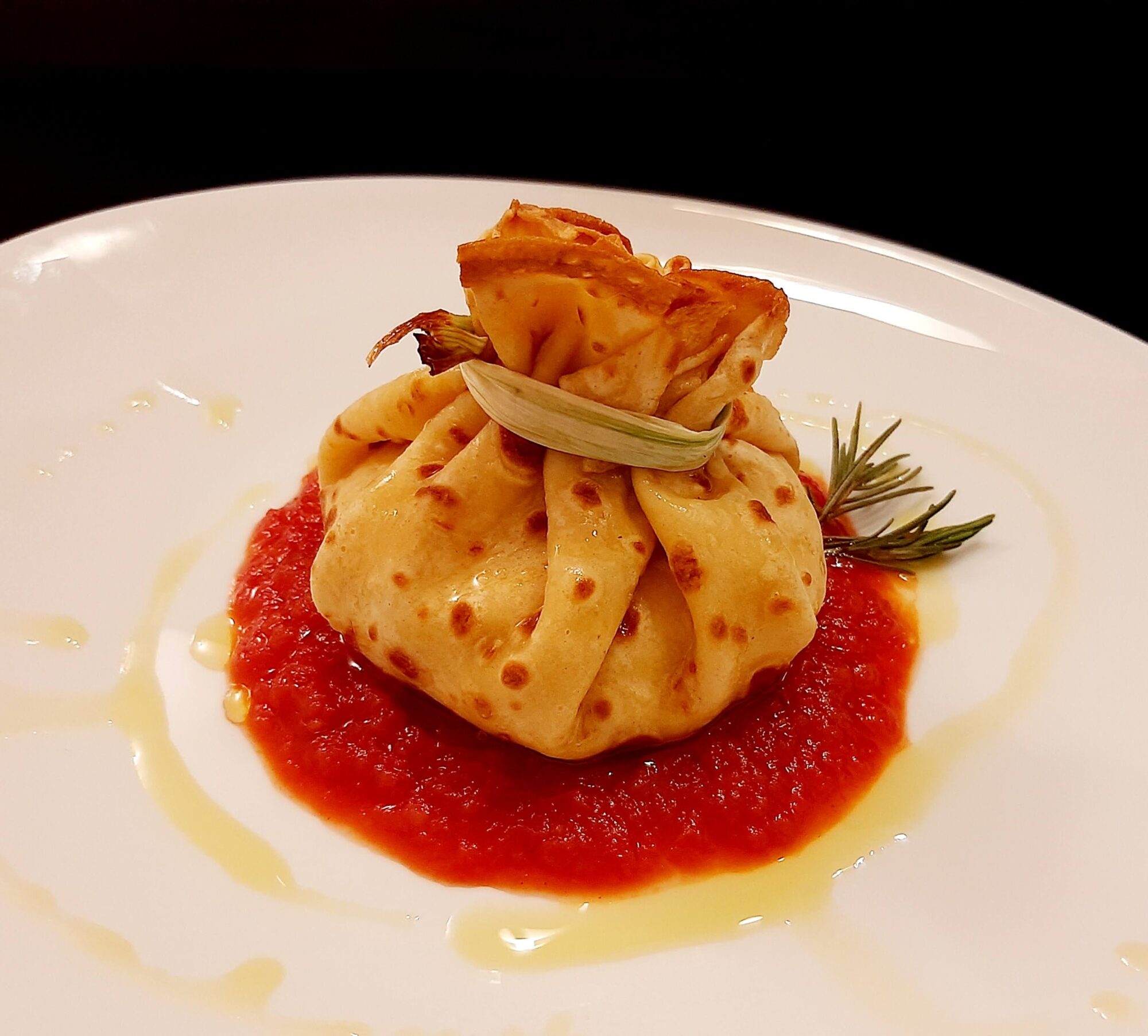- preparata il vostro piatto mettendo alla basa la passata di pomodoro e riponendo sopra il fagottino.