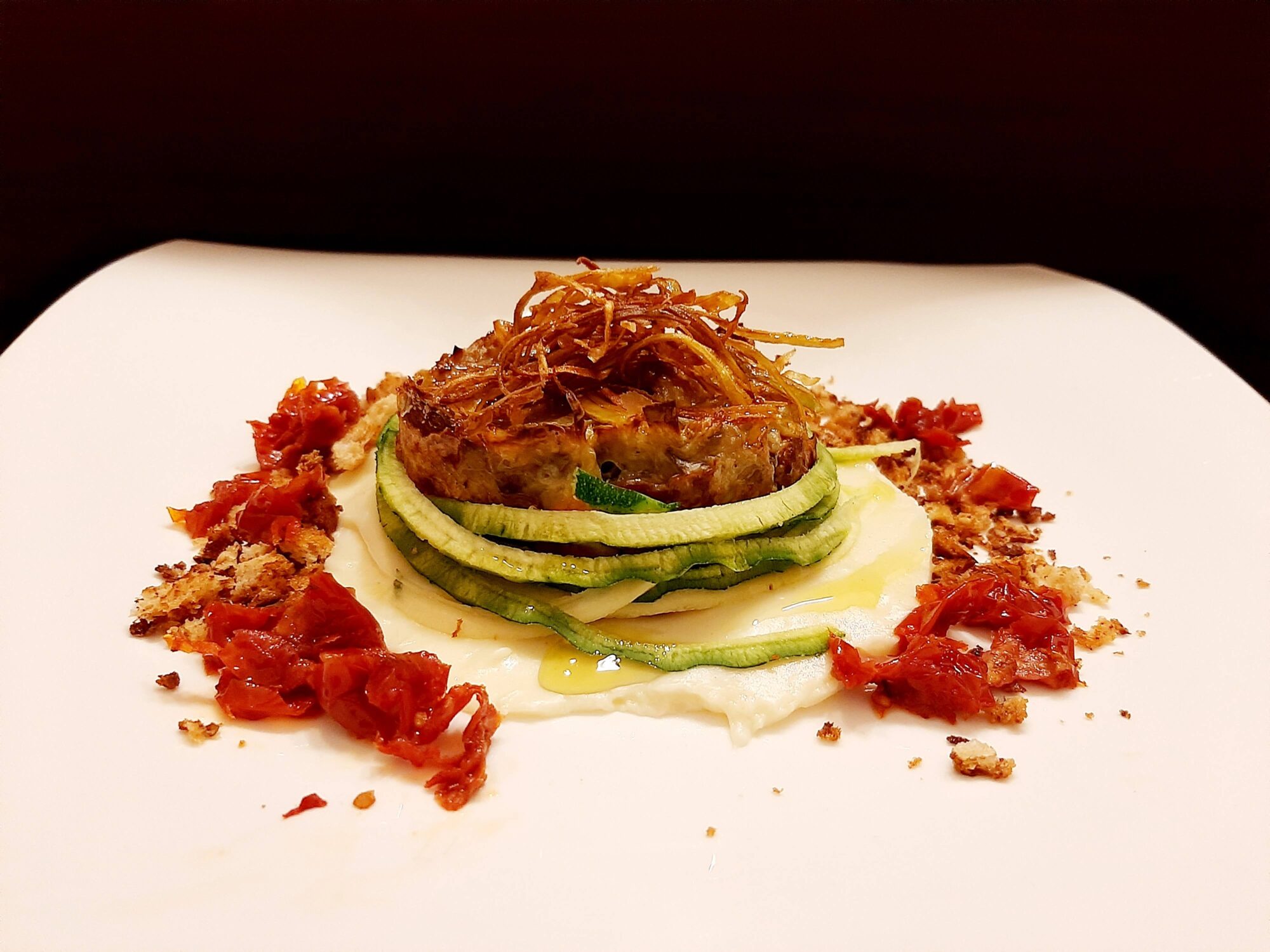 - componete il piatto. Versate tre cucchiai di crema al parmigiano in un coppapasta così da ottenere un cerchio perfetto. Posizionate sulla crema un nido di spaghetti di zucchine e sopra questo la vostra frittatina. Terminate il piatto con una striscia di crumble di pane e pomodorini, qualche goccia di aceto balsamico, erbe miste una spolverata di pepe nero.
