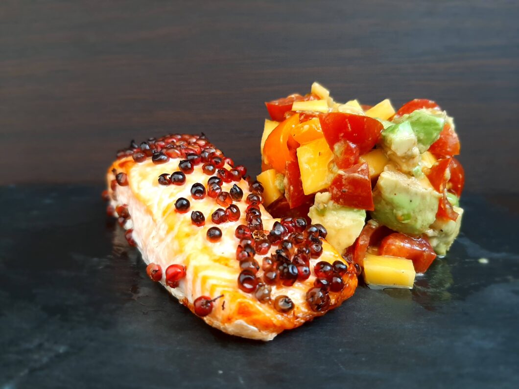 - servire il salmone con il mango, l’avocado e i datterini irrorati con aceto di mele e olio evo.