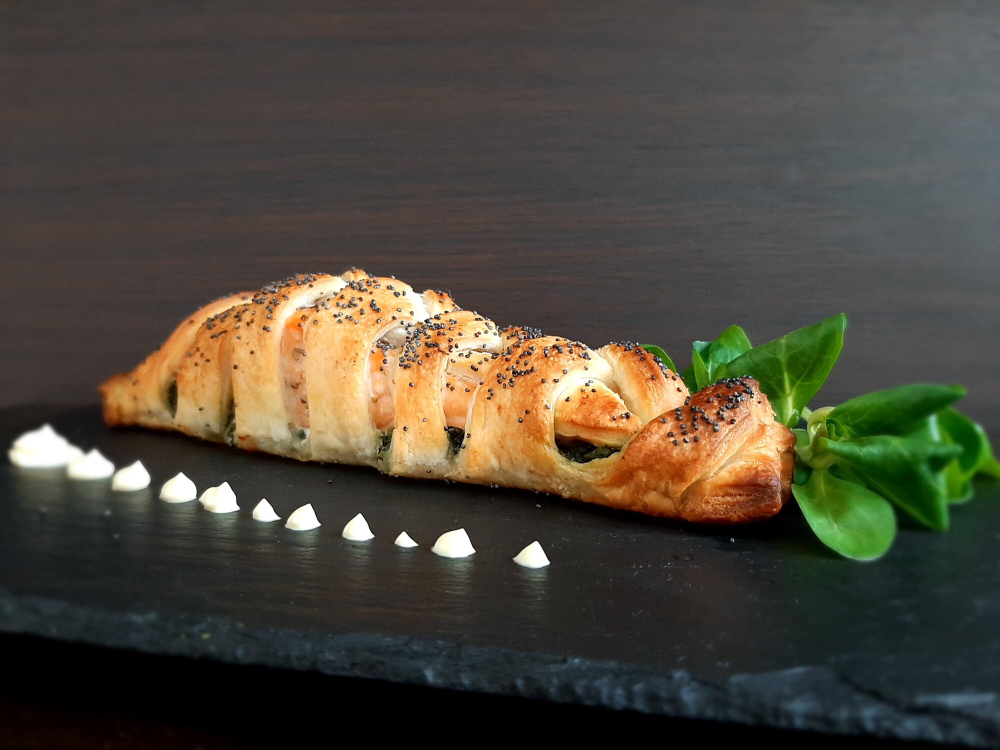 Salmone con friarielli in crosta di sfoglia e semi di papavero