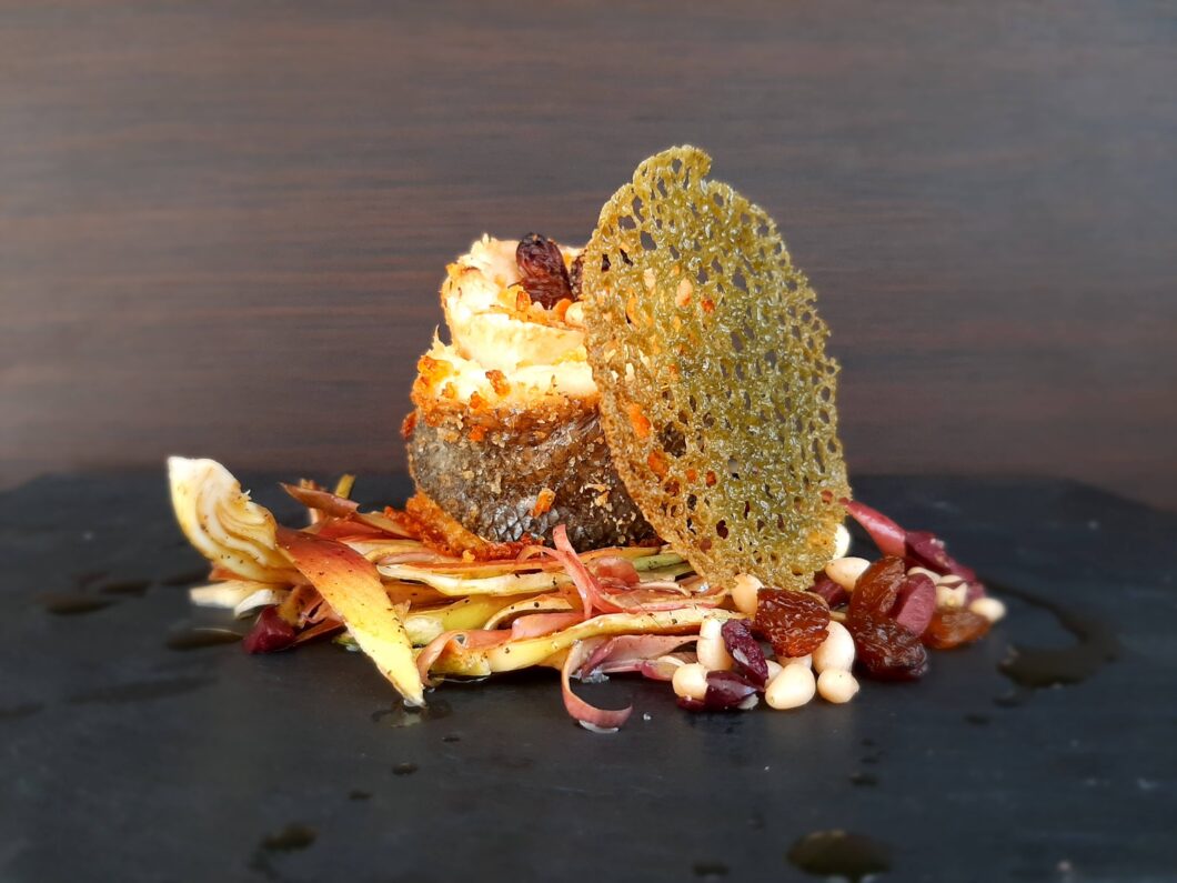 - lavate i filetti di branzino e asciugateli. Stendeteli su un foglio di carta da forno posizionato su una teglia. Mettete sul filetto un mix di erbe aromatiche, uvetta, pinoli e olive precedentemente sminuzzate. Avvolgete il filetto creando in vostro involtino. Passatelo nell’impanatura (ricordatevi di mettere delle erbette nel pan grattato, la renderà più gustosa). Coprite con un filo di olio, sale e pepe e cuocete per 20 minuti a 180°;