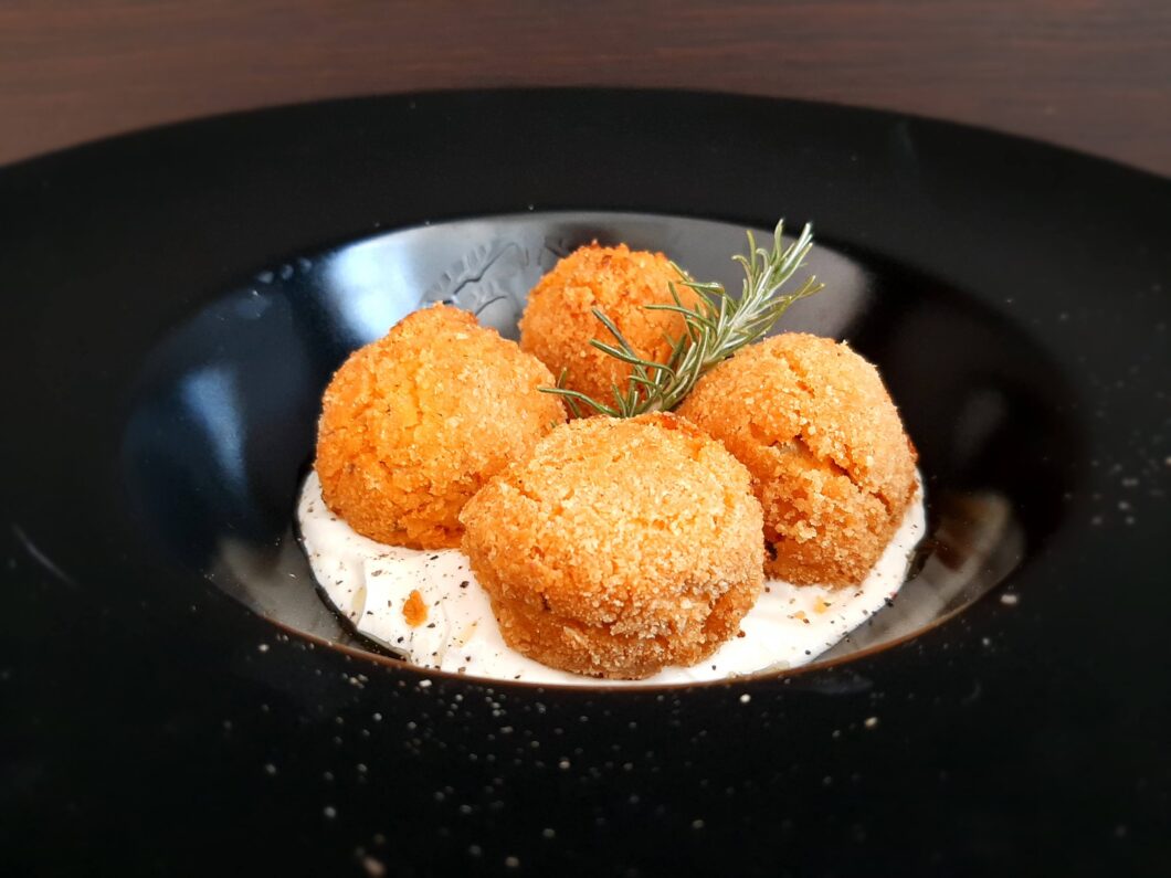 Sfere di verdure con salsa di yogurt ed erba cipollina