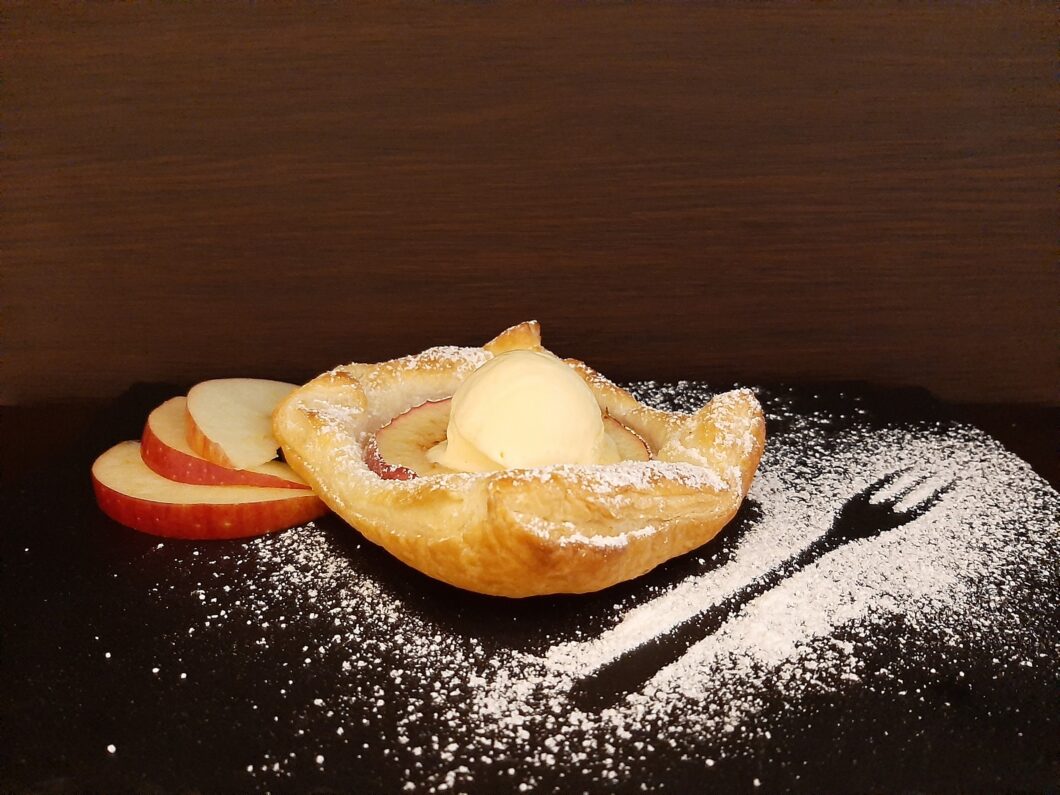 Sfogliatine dolci con mele rosse e gelato alla vaniglia