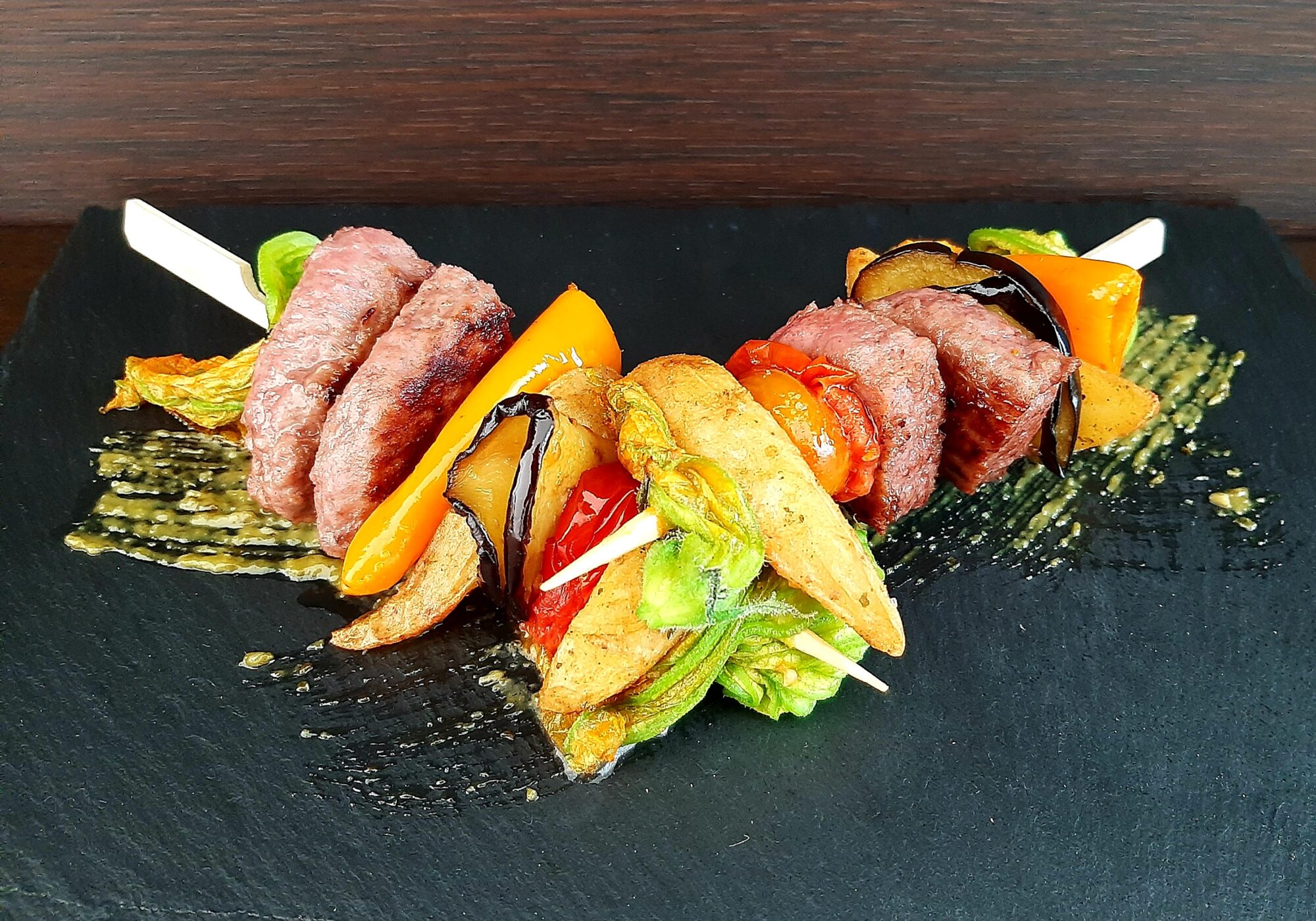 - passate alla composizione dei vostri spiedini. Dalla mia foto potete capire l’alternanza che ho dato io: fiore di zucca per primo, carne, peperone, patata al forno, melanzana, pomodorini, ancora patata e fiore di zucca ma…inutile dirvi di dare spazio alla vostra fantasia per comporre i vostri spiedini…e buon appetito.