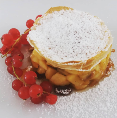 - servite lo strudel scomposto posizionando a fianco un rametto di ribes o lamponi.